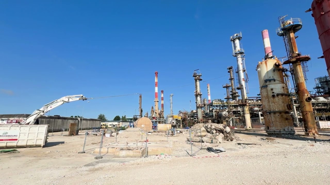 Premier abattage par tirage au câble sur l’unité Alkylation dans l’ancienne raffinerie de Grandpuits (77)